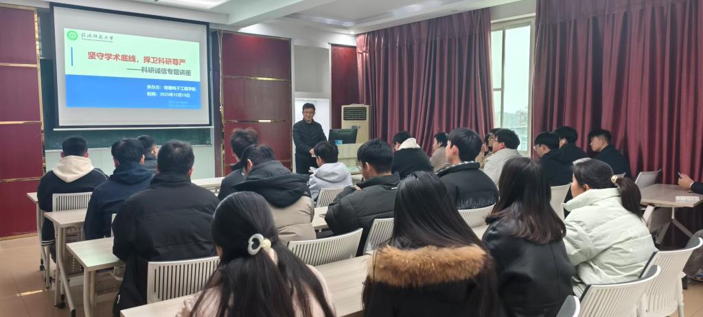 为深入推进科研诚信建设,营造风清气正的学术环境,2025年12月10日,活动邀请刘墨林教授担任主讲,举办了以“坚守科研诚信,筑牢学术根基”为主题的讲座,本次讲座围绕科研不端行为的界定与案例展开深入讲解,旨在面向物理学、电子信息、电子科学与技术及学科教学(物理)四个专业的学生,系统强化科研规范与学术道德意识。