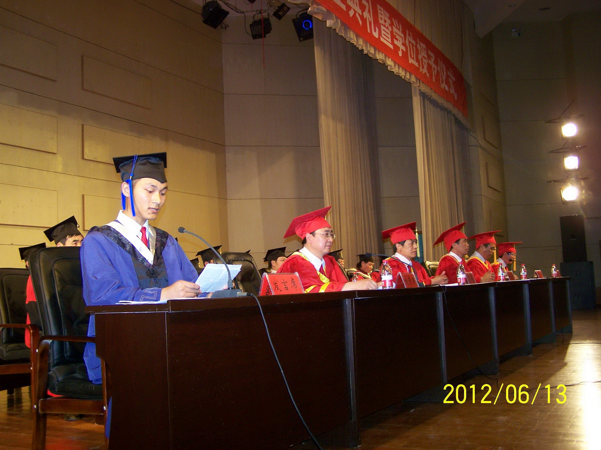 6月13日,我校2012届硕士研究生毕业典礼暨学位授予仪式在艺术楼报告厅举行。校党委书记孙宏典,校学位评定委员会主席、院长卢克平,副院长李俊,校学位评定委员会副主席、副院长李义凡,副院长刘彦明出席毕业典礼暨学位授予仪式,各培养学院负责人、研究生导师代表、毕业研究生家长代表、研究生教育管理工作人员、本年度研究生学位获得者以及全体在校研究生参加了典礼和仪式。毕业典礼和学位授予仪式由刘彦明教授主持。