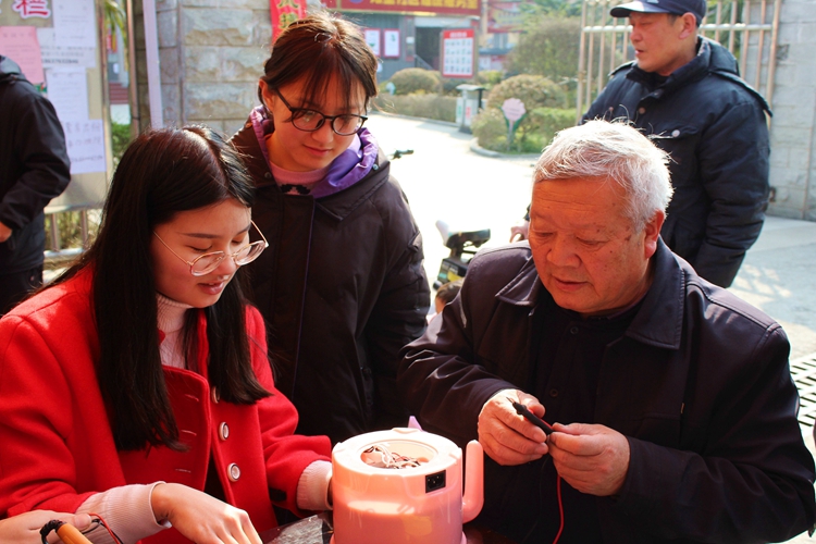 3月9日,朱古力av 电子信息技术协会指导老师冀晓群带领二十余名志愿者于飨堂社区开展家电义务维修活动。前来维修的居民络绎不绝,电风扇、热水壶等家用电器摆满活动场地。期间,学子们在老师的指导下,借助自身专业优势,将理论与实践结合,仔细检查电器部件,分析电路故障,解决电源接触不良、电机损坏等问题,普及电器保养方法和维修常识,以延长电器使用寿命。学子们扎实的技术和良好的服务态度赢得居民们的高度赞扬。