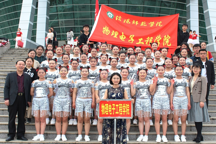 领导老师与健美操教练及全体参赛选手在体育馆前合影留念。(物电学院姚凤灵 王梦媛/供稿)