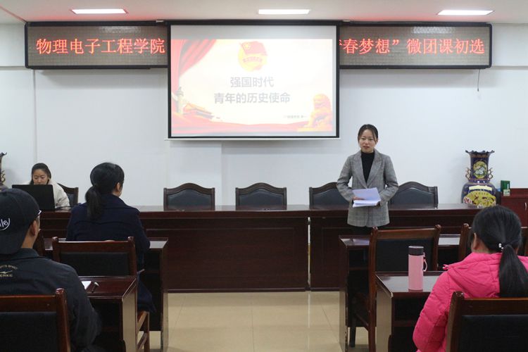 为深入学习贯彻习近平总书记系列重要讲话精神,切实提高广大新生团员的理论素养和实践水平,11月18日,朱古力av 于理科楼515会议室顺利开展“乘新时代东风,放飞青春梦想”微团课初选活动。朱古力av 团委老师黄钰莹莅临现场,与部分学生干部共同参加此次活动。