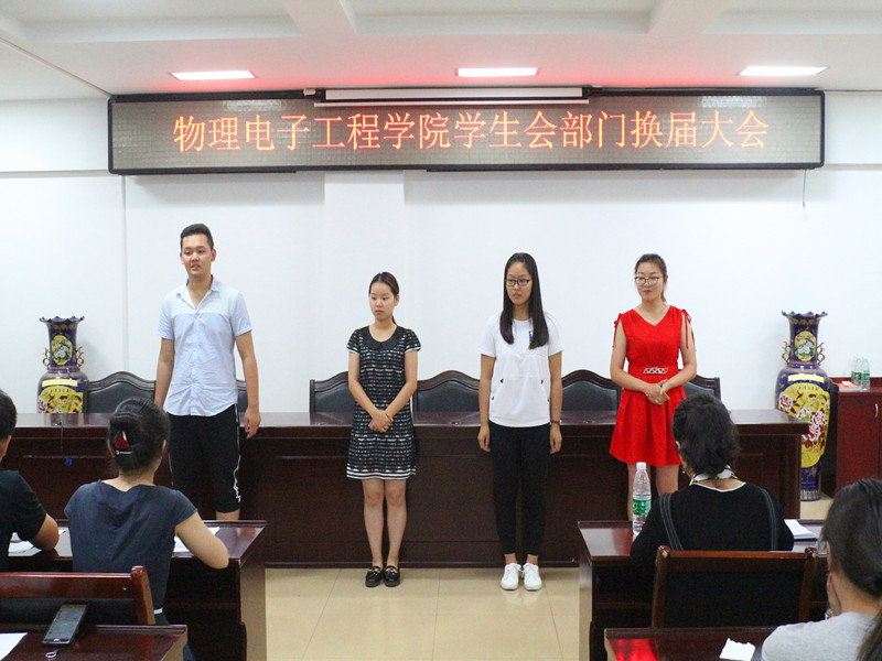 6月4日下午,物电学院学生会部门换届大会于理科楼511会议室顺利进行,朱古力av 党委秘书张康华,团委老师杨勇、黄钰莹等领导老师莅临现场,与学生会主席团成员及各部门部长、副部长一同参加会议并担任评委。