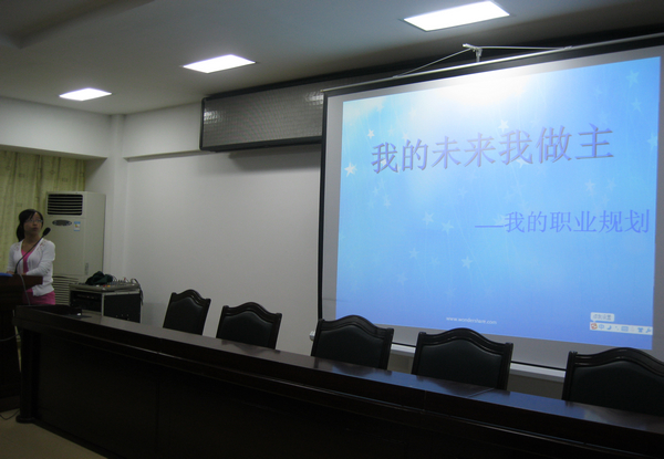 团总支书记刘华超担任此次大赛的指导教师。刘盟盟根据自己参赛时所用的ppt资料,深入浅出的为同学们作了精彩的演讲指导。刘盟盟将职业规划分为三部分:职业确定篇;职业简析篇;决策实施与调整篇。她风趣幽默的演说,深深地打动了现场的每个人,同学们都对刘盟盟的职业规划赞叹不已。接下来,刘盟盟又为同学们讲解了有关ppt制作的注意事项。刘盟盟又针对在演讲时需要注意的方面,给出了一些建议:演讲时要有亲和力,更要有自信。她认为,良好的精神风貌是令他人信服自己的最佳武器。此次活动最终将在这40余名同学中选拔出8名同学参加我校的“职业生涯规划大赛”复赛。