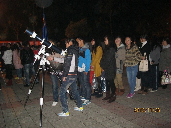 活动现场,大型的观测设备和隆重的场面吸引了来往同学的驻足观看,他们耐不住强烈的好奇心和求知欲加入了观测行动。协会的工作人员们一边耐心细致地讲解怎样使用天文观测设备,以及怎样观测月球上的环形山、陨石坑等天文景观,一边亲自给大家做示范。同学们在指导下,借助天文望远镜成功真实的看到了壮丽的天文景观,大家都很兴奋。另外,一些会员们还告诉同学们怎样通过电脑观看模拟的星空和精美的地月图片,让他们更近距离的了解太空,了解宇宙。同学们就自己的疑惑发问,现场掀起了一股求知天文知识的浪潮,气氛异常热烈。