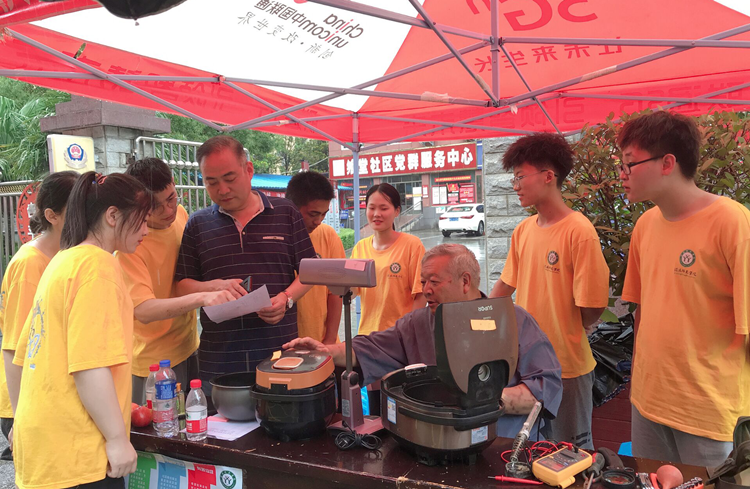 在疫情防控常态化的形势下,朱古力av 按照学校“三下乡”暑期社会实践工作通知要求,以“学党史悟思想 我为群众办实事”为主题,组建大学生社会实践服务队于2021年7月5日至7日走进信阳市浉河区金牛山街飨堂社区开展义务家电维修、电力安全进家庭科普宣传等服务活动。