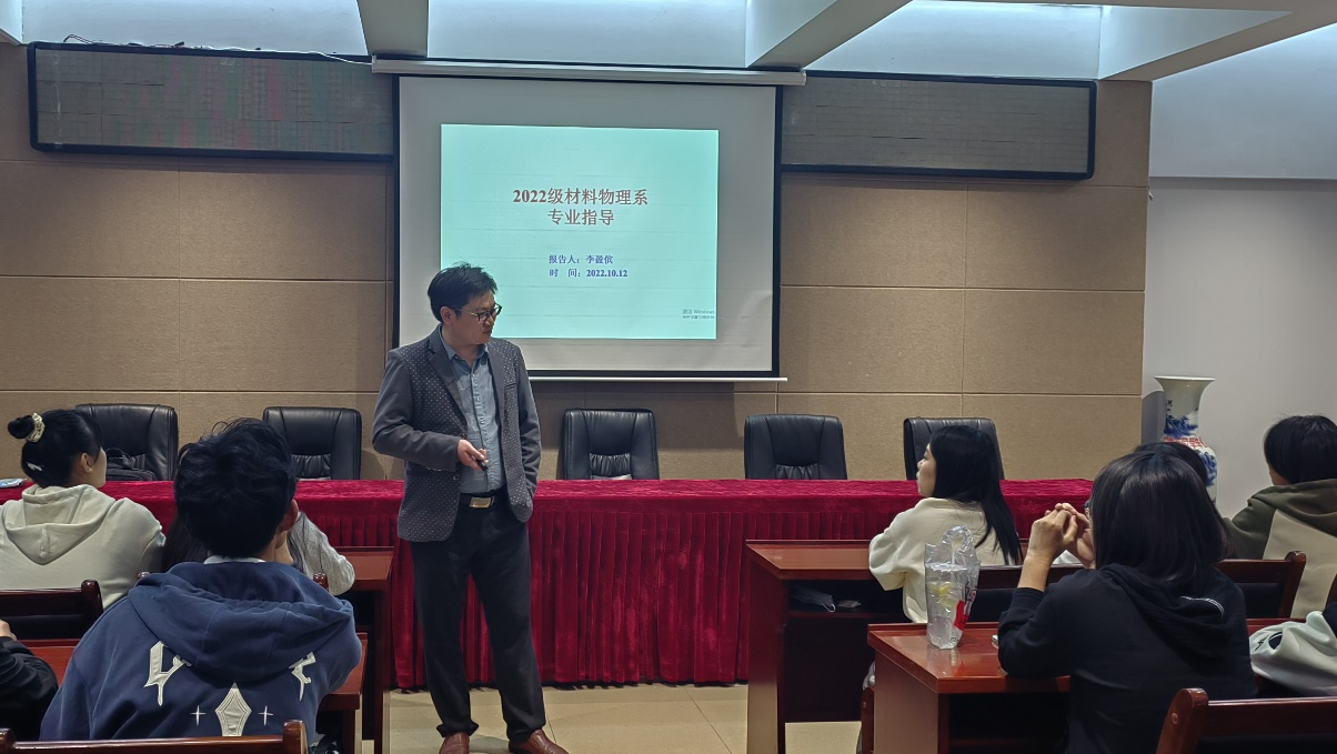 10月12日,朱古力av 在理科楼4楼连廊会议室举行新生入学教育系列讲座之“听”-专业成长讲座。此次讲座由材料物理系主任李盈傧博士主讲,2022级材料物理学班全体学生参加。