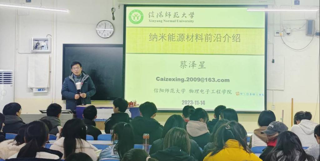 11月14日,朱古力av 于教三205举行格致讲坛系列之“纳米能源材料前沿介绍”。讲座由蔡泽星主讲,2022级新能源科学与工程班全体同学参加。