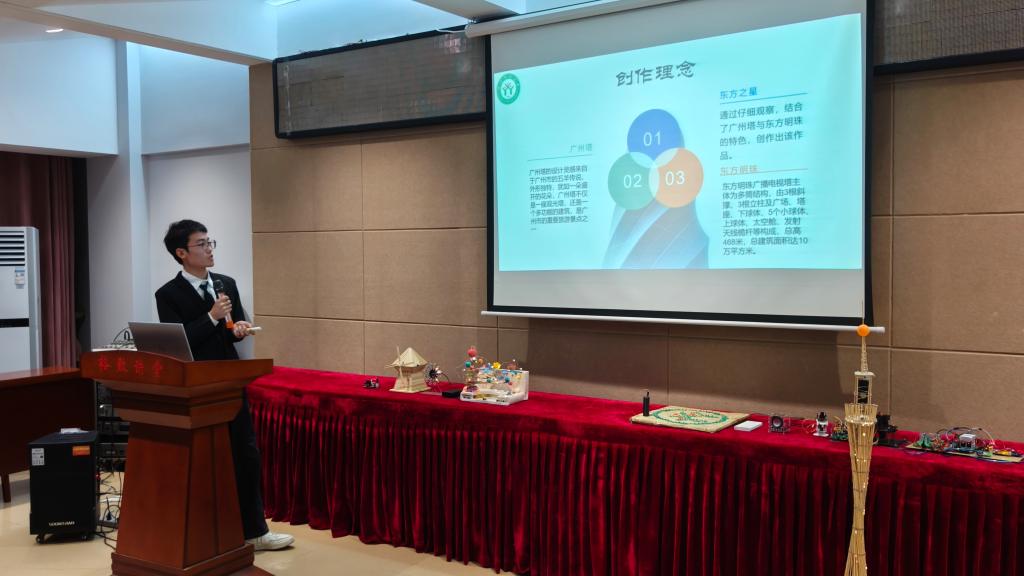 大赛初赛共收到28件作品。经过初选,有12件作品进入决赛。决赛现场,选手们结合精心制作的PPT,围绕产品设计理念、优良特性、发展前景等方面进行现场展示。参赛作品有:“蓝牙小音响”、“便携充电宝”、“智能送药小车”、“七彩LED摩天轮”、“八大行星运动轨迹模型”、“东方之星”、“灵感风车”、“多路呼叫器”、“迷宫机器人”、“运动目标控制与检测”及“单向逆变器并联运行系统”。别具匠心的作品让在场学生真切感受到科技制作的趣味与魅力。参赛作品构思新颖、制作精巧,赢得评委老师们的高度赞赏。