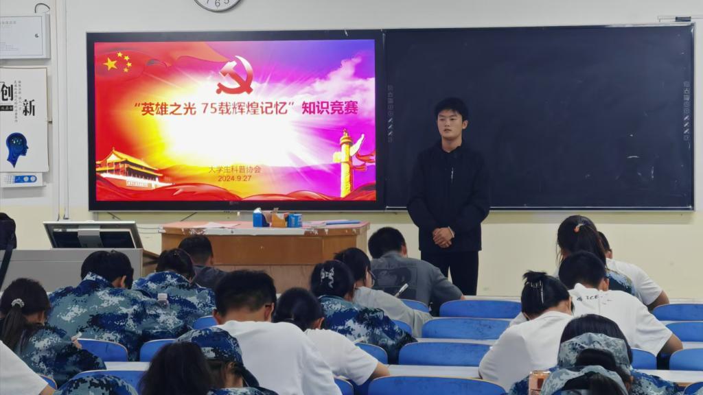 为庆祝建国七十五周年,激发学生的爱国热情,9月26日,朱古力av 在教三205成功举办“英雄之光•75载辉煌记忆”知识竞赛。本次活动由大学生科普协会精心策划并组织实施,2024级学生积极参与。