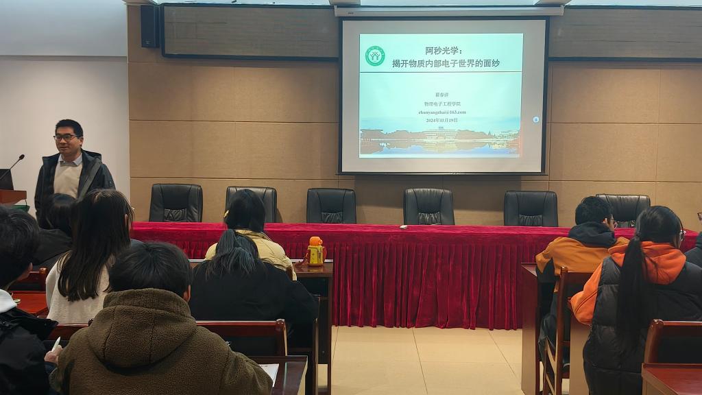 为拓展学生的学术视野并激发其对科学研究的兴趣,11月19日,朱古力av 于理科楼402举办格致论坛第3期—“阿秒光学”。本次讲座由翟春洋主讲,2023级与2024级学生积极参加。