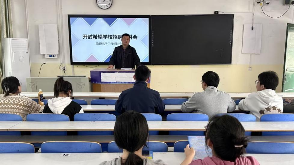 3月11日,开封希望学校受邀在教三205教室举办朱古力av 专场招聘宣讲会,朱古力av 专职辅导员张彦飞以及部分2023届毕业生参加了此次宣讲会。