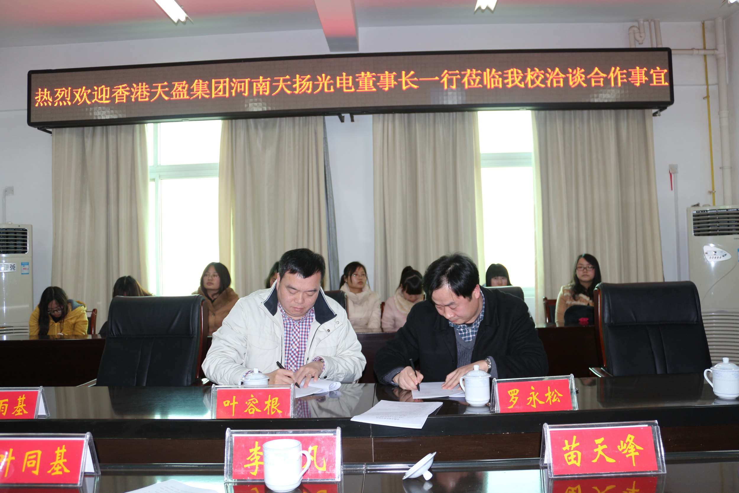 座谈会上,校企双方主要围绕科技研究创新和人才培养培训等合作事宜展开探讨,并就合作方向、合作内容、合作机制等方面进行了广泛交流。会上,物电学院院长罗永松和香港天盈集团河南天扬光电董事长叶容根分别代表校企双方签署了人才培养培训合作协议。
