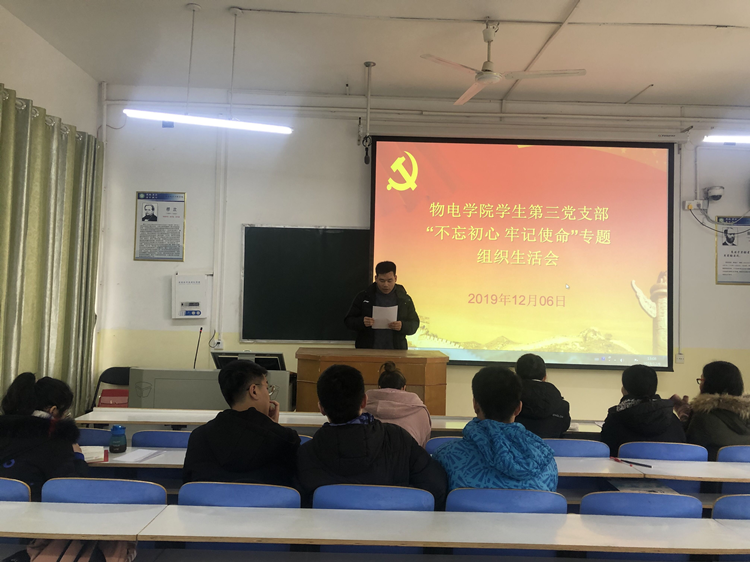 12月9日,学院学生第一党支部、学生第二党支部、学生第三党支部、学生第四党支部、研究生党支部分别在教二楼T1教室、教三楼05教室、06教室、理科楼501会议室开展“不忘初心、牢记使命”专题组织生活会;12月10日,学院教工第一党支部、教工第二党支部、教工第三党支部分别在理科楼911会议室、501会议室、511会议室开展“不忘初心、牢记使命”专题组织生活会。各党支部全体党员参加,活动分别由各支部书记主持。