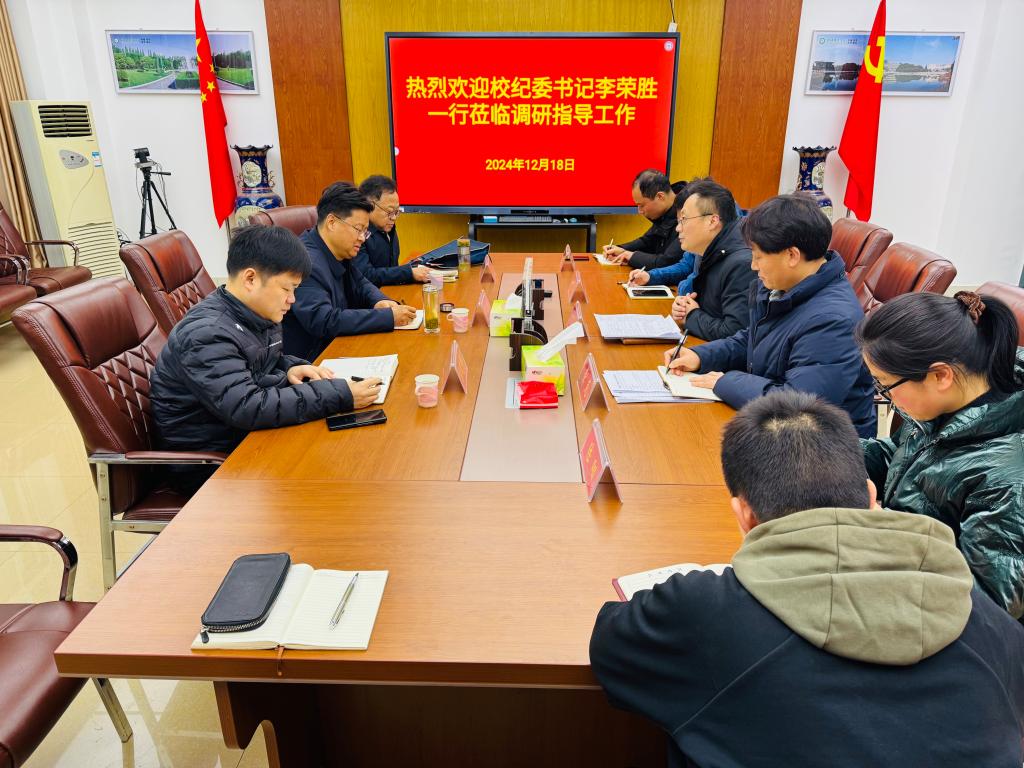 12月18日,校纪委书记、监察专员李荣胜到朱古力av 调研指导工作。校纪委副书记兼目标管理与督查办公室主任周经兵、第三监督检查室副主任张晓博陪同调研。