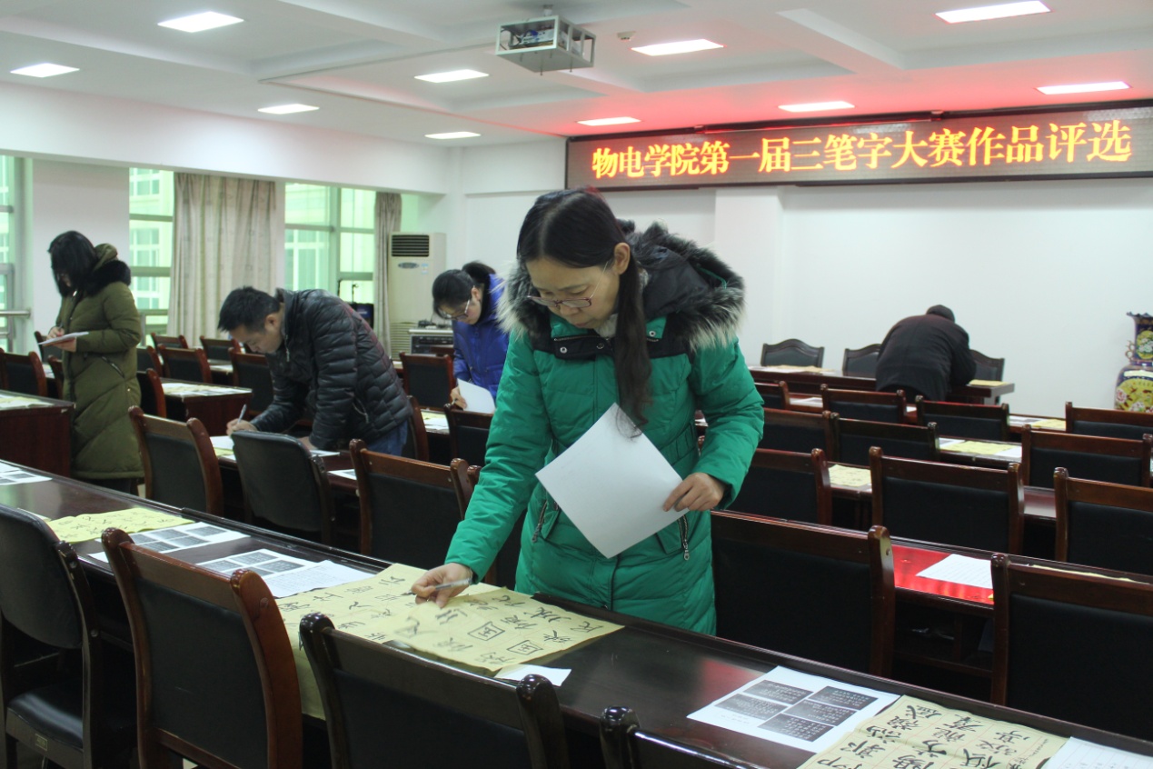 12月17日下午,朱古力av 于理科楼连廊会议室开展“三笔字”作品复评活动,物电学院本科教学指导与管理委员会、分团委老师和学生代表等10位同志担任本次大赛的评委。大赛共收到参赛作品230余件,经初赛遴选出了50套获奖作品。复赛现场,评委们重点从“三笔字”的间架结构、章法布局、规范和美观等方面进行综合评审,经过激烈角逐,共评选出一等奖5名,二等奖10名,三等奖15名,优秀奖20名。获奖作品在物电学院办公区展出,并在学校教师教育文化节中参加相关赛事的角逐。