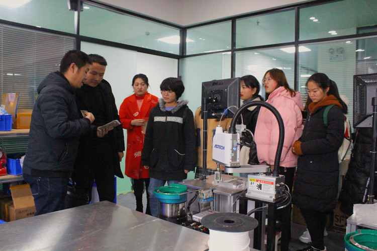 学子们在该公司主管王嘉明,课长曹翠的带领下进入公司参观实验室、车间、宿舍楼等建筑,通过观看宣传片了解公司概况。学子在积极的交流中得知,该公司近年来致力于磁性材料应用研发和自动化生产开发项目,拥有设备自主开发团队和创新人才,拥有1项发明专利,67项实用型专利,目前公司在自动化生产电子终端产品,用磁组件上已取得突破性进展。分拣,组装及擦胶等工艺已实现自动化生产,实现自动化后提升效率,并大大降低质量风险,由自动化设备来取代人,可提升产能2倍,减少50%的人力,提高质量保证。参观结束,张昆总结到,见习培训授经验,专业学习谋发展,希望学子们做到学以致用,掌握专业领域,充分认识到理论与实践相结合的重要性。