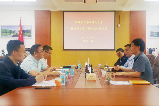5月24日,海南师范大学物理与电子工程学院赵世华副院长一行3人来朱古力av 就师范类专业认证工作进行交流研讨。副院长龚克,专任教师代表孙金土和冯一兵老师参加了交流研讨会。会议由汤清彬副院长主持。