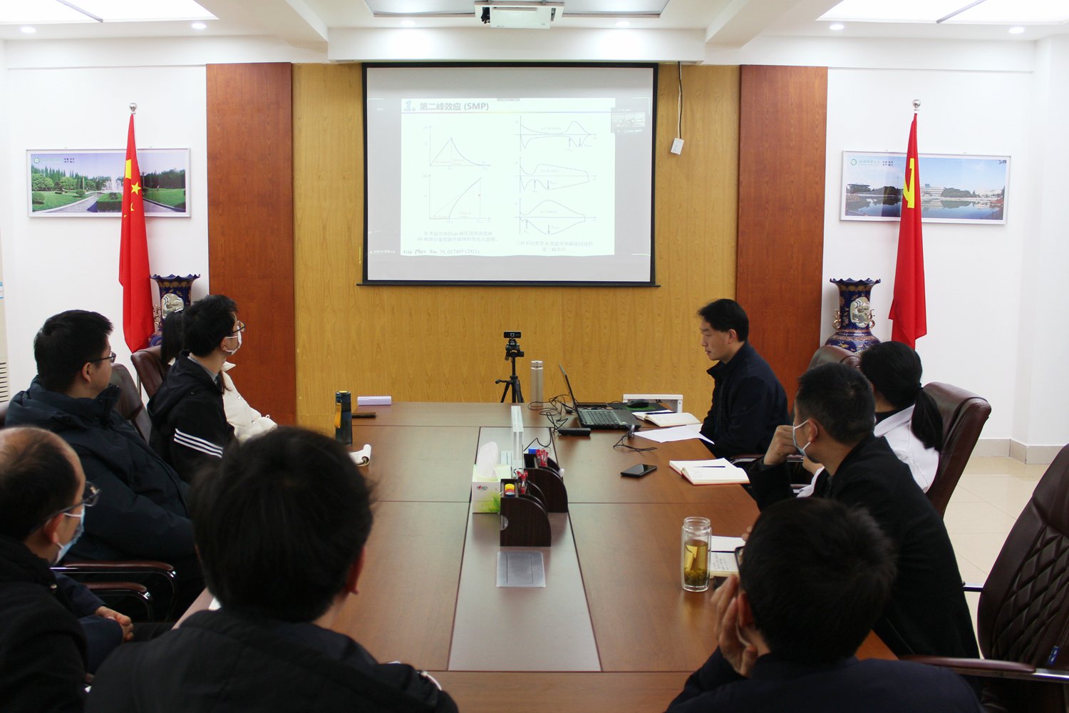 施智祥首先讲解了第II类超导体的磁化特征,详细介绍了三种不同类型II类超导体磁滞回线的第二峰效应,针对铁基超导体中第二峰效应的物理起源问题,分别展示了课题组在112型、12442型以及11型铁基超导体第二峰效应及磁通钉扎机理方面的研究成果。随后介绍了研究团队目前的实验条件、研究方向与工作进展。报告结束后,施智祥同与会人员就相关研究内容进行了深入讨论,并详细回答了师生的提问。
